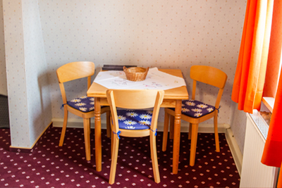 Ausgestattet mit Eßtisch mit 4 Stühlen, Mikrowelle, 2 Kochplatten, Toaster, Kaffeemaschine, Wasserkocher, Geschirr und Besteck für 6 Personen.